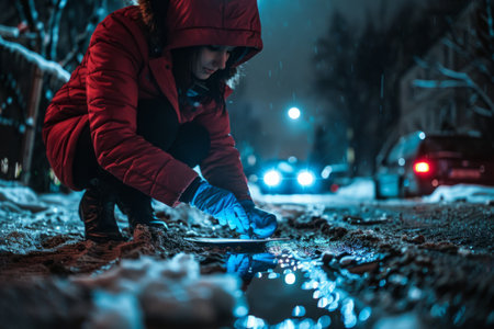 A man in a brown coat, gloves, and a hat is falling on a wet, icy street during a snowy night. The scene is illuminated by blurred city lights, creating a reflective surface on the pavement. Snowflakes are falling, and other people are walking in the background, creating a sense of movement and activity. The overall mood is cold and wintry, capturing the challenges of navigating icy conditions in an urban setting.