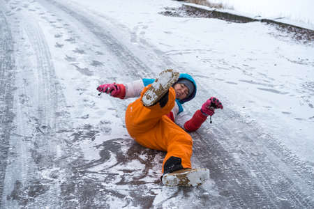 Shot of person during falling in snowy winter park. Woman slip on the icy path, fell and lies. Danger of season trauma.
