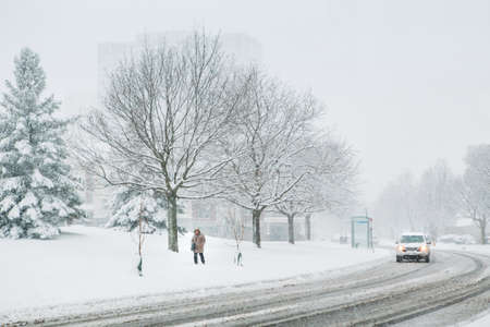 Man walking under snow. Heavy snowfall and snowstorm in Toronto, Ontario, Canada. Snow blizzard and bad weather winter conditions. Poor visibility, seasonal danger for drivers on streets.