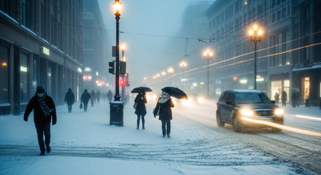 A bustling city street scene blanketed in snow, featuring people in motion amid falling snowflakes. The chilly atmosphere creates a serene yet lively winter moment.