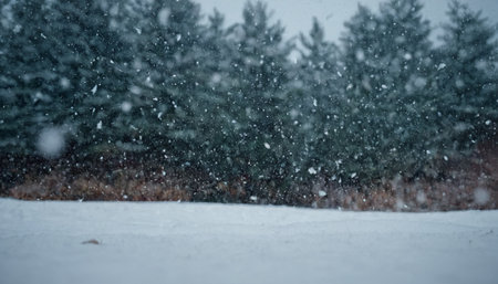 A captivating scene of snow falling gently over a dense evergreen forest at night, creating a tranquil and magical atmosphere perfect for winter-themed projects.