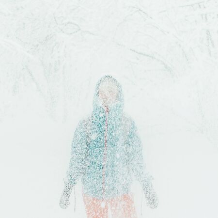 Silhouetted by a man walking along a snowy street. Heavy snowfall in the city. Blurred image of a man. Web promo banner background for advertising