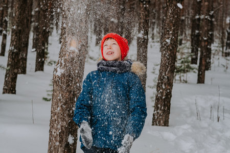 A boy walks in the snow in the winter forest. A child throws snow over his head. Happy winter holidays with snow