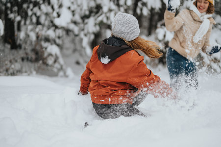 Family playing in snowy forest, laughing while tossing snow, capturing winter bonding moment between parents and children