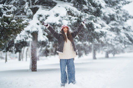 The young woman joyfully holds up palms under the falling snow. She on walk in the winter park. The woman is dressed in a bright jacket and knitted gloves and a cap. The falling snow causes delight.