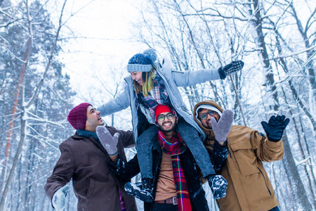 Cheerful Friends Enjoying a Winters Day in a Snowy Forest