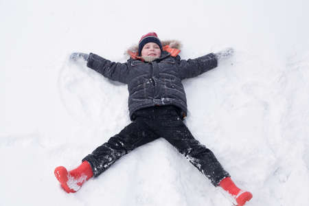 Child lying in snow making angel wings shape. Angel kid play in winter. Winter fun with a happy child making snow angels.