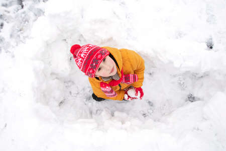 Funny little boy in colorful clothes playing outdoors during a snowfall. The child looks up from the snow pit.