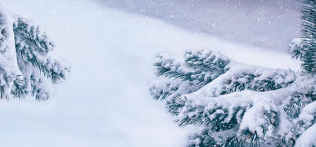 Christmas festive background. Fluffy spruce branches in snow winter landscape. Mock up for postcard copy space banner