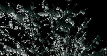 The branches of the tree are covered with white snow.Night snowfall in the forest.