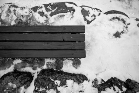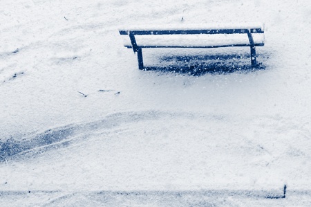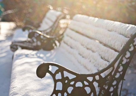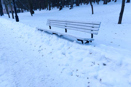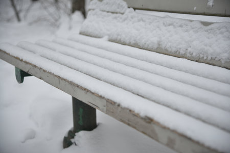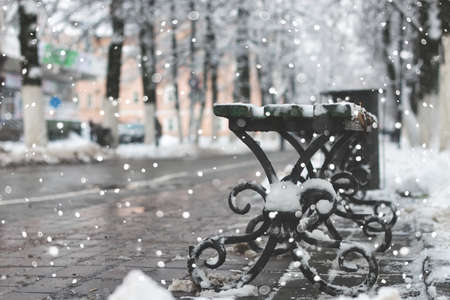 Bench covered with snow in the city park. Winter time. Selective focus.