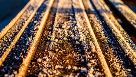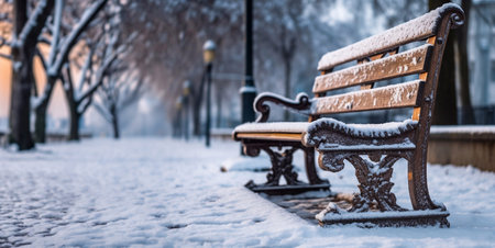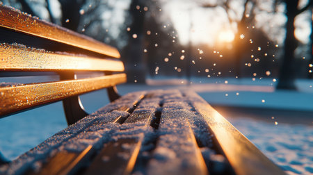 A close-up view of a snow-covered park bench at sunrise, capturing sparkling snowflakes in the early morning light, evoking a serene winter atmosphere.