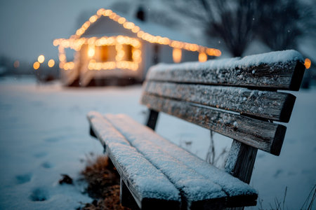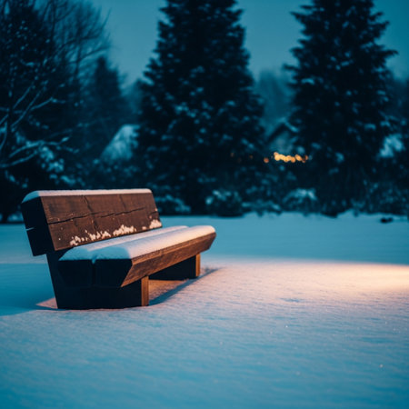 A serene winter scene featuring a snow-covered wooden bench, illuminated by twinkling lights. Snowflakes gently fall, creating a cozy, festive atmosphere, perfect for quiet moments in an urban landscape.