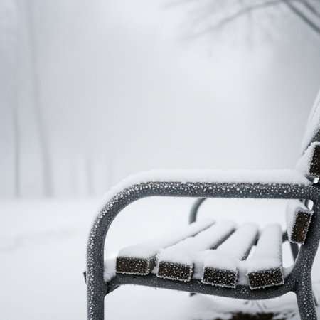A tranquil scene of a snow-covered park bench amidst falling snow, surrounded by winter trees and a quiet atmosphere.