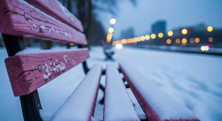 Close-up of a red park bench dusted with snow, with a blurred background of a snowy path and glowing streetlights creating a serene winter atmosphere.