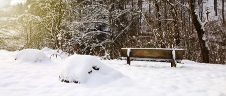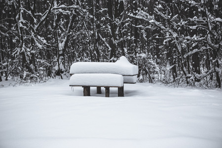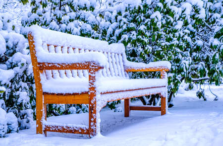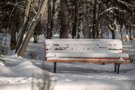 Park bench covered with snow in winter. Beautiful winter landscape in the park.