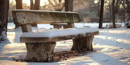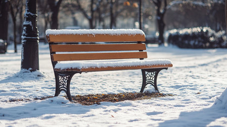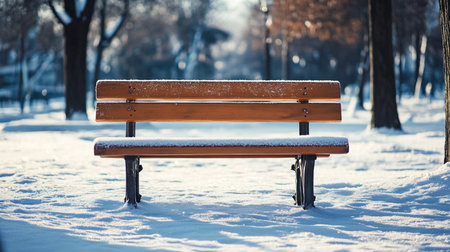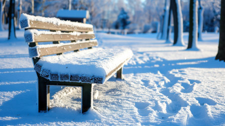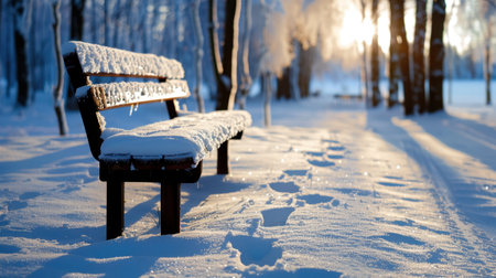 A serene winter scene showcasing a snow-covered bench nestled in a peaceful park. Sunlight casts soft shadows on the pristine snow, enhancing the tranquil atmosphere.