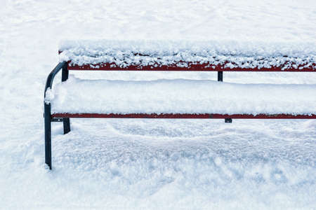 Snow covered wooden bench in winter park. Red simple bench with white fluffy snow on clear white snow background