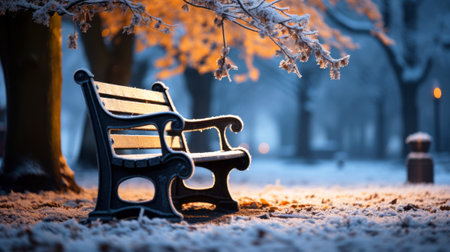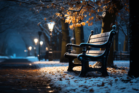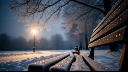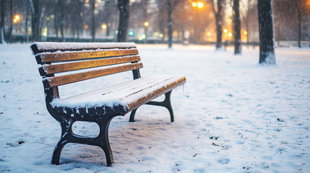 A solitary wooden bench sits nestled in a snow-covered park, illuminated by the warm glow of street lights at dusk. This serene winter scene captures the essence of a quiet evening, with softly falling snow and a tranquil atmosphere. The image features a beautiful bokeh effect created by the lights, enhancing the cozy and peaceful mood. Ideal for projects evoking winter, nature, or urban landscapes, this image is perfect for websites, marketing materials, and seasonal promotions.