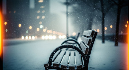 A snow-covered bench in a city during a snowfall, with blurred lights in the background and a winter atmosphere