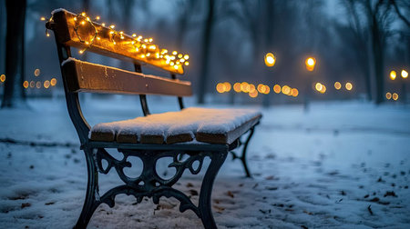 A serene winter scene with a bench adorned with glowing string lights. The soft illumination creates a cozy ambiance amidst the snow-covered park.