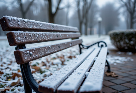 An empty park bench sits covered in snow during a soft winter snowfall, creating a peaceful and tranquil scene in the park.