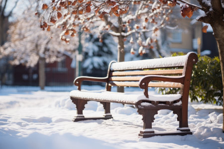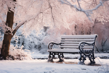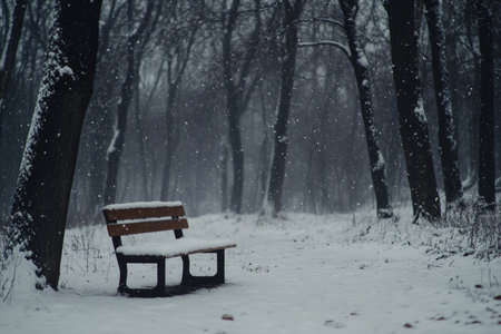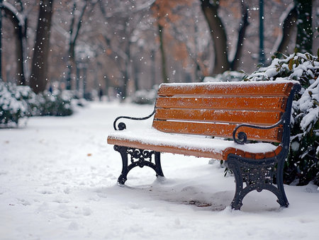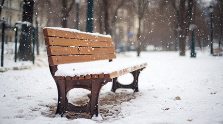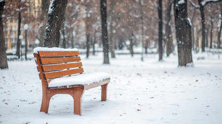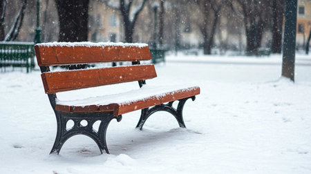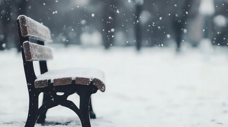 A peaceful winter scene showcasing a snow-covered bench in a quiet park, surrounded by gently falling snowflakes and blurred trees, evoking tranquility and solitude.
