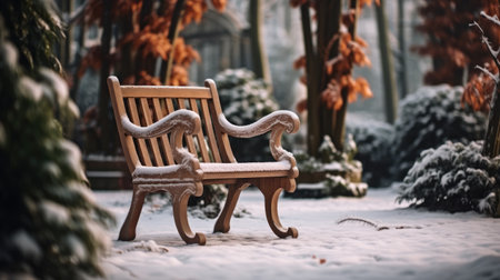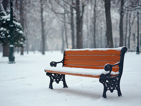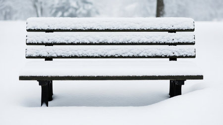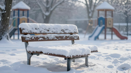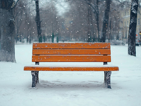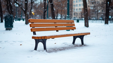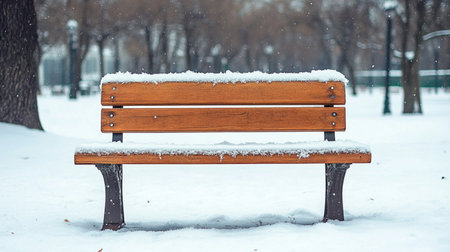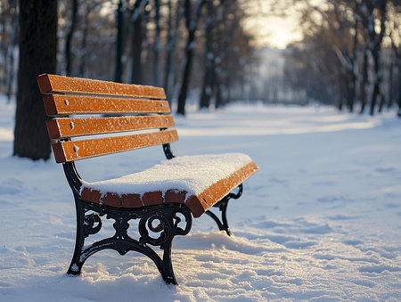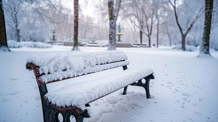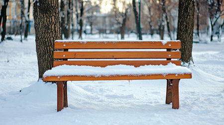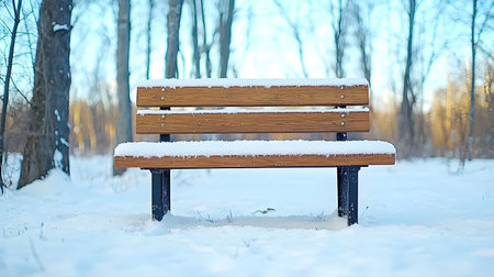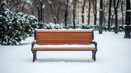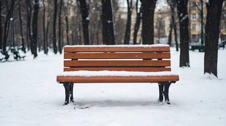 A lonely wooden bench sits covered in snow in a quiet winter park, surrounded by frosted trees. Serene outdoor landscape.