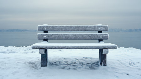 A tranquil winter landscape showcases a snow-covered wooden bench beside a frozen lake at sunset, inviting relaxation and peaceful reflection in nature.