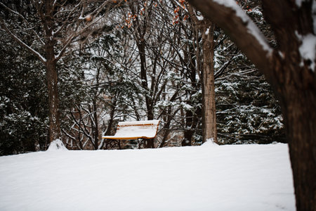 Winter Wonderland: A Snow-Covered Brown Outdoor Bench Amidst Nature's Beauty