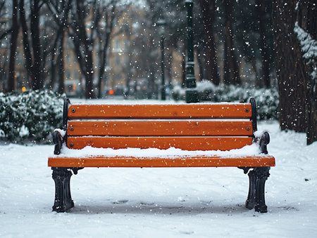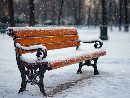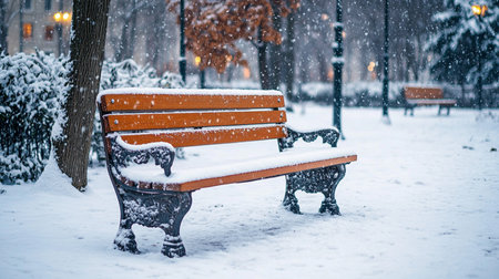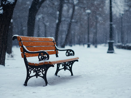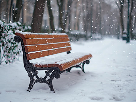 A wooden park bench dusted with snow in a winter park setting with falling snow, evoking a quiet, tranquil atmosphere.