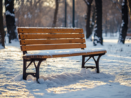 A solitary wooden bench sits dusted with snow in a park, illuminated by sunlight on a serene winter day, with trees visible.