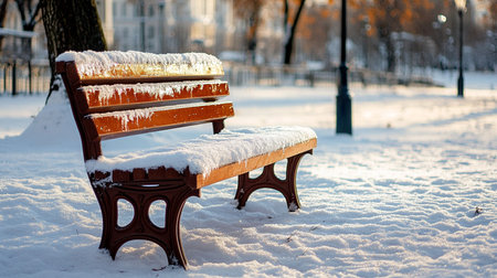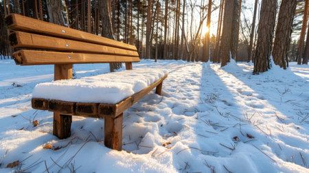 A tranquil winter scene featuring a wooden park bench dusted with snow, illuminated by the warm glow of the morning sun.