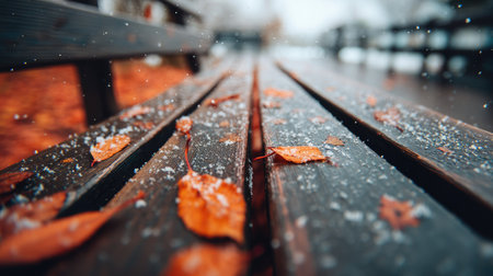 A close-up view of vibrant autumn leaves resting on a wooden bench, with gentle snowfall creating a serene outdoor atmosphere and seasonal beauty.