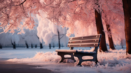 AI Generated. Bench in the city snow-covered winter park with a lake and beautiful trees in frost in morning Beautiful natural park in blue and pink colors