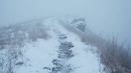 A serene snowy trail leads through a foggy winter landscape, with bare trees lining the path and snow blanketing the ground, evoking solitude.