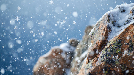 A close-up view of snowflakes gently falling on a rocky surface, creating a serene winter atmosphere filled with tranquility and beauty.
