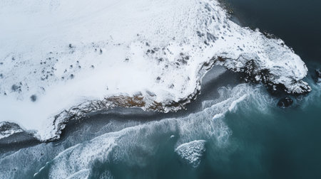 Aerial view of a snow-covered coastline with waves crashing on the shore
