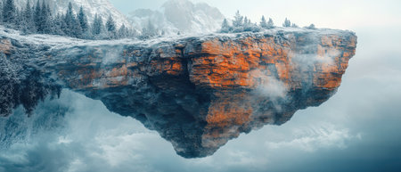 A majestic cliff floats above a misty valley surrounded by pine trees creating a surreal and enchanting natural spectacle.