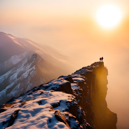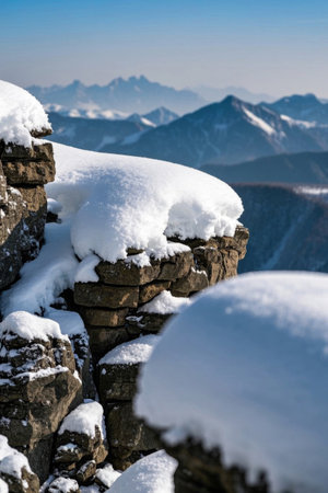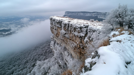 Breathtaking view of a snow-covered cliff overlooking a valley shrouded in fog during the winter season