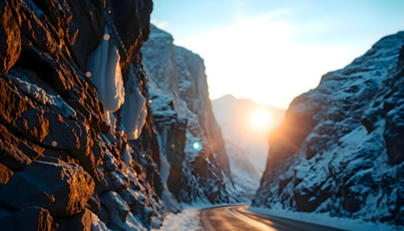 Turquoise water flowing between icy banks in a snowy canyon creates a breathtaking contrast of vibrant colors and intricate textures within a serene winter landscape