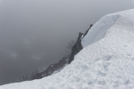 Snowy view of the mountain landscape of Vosges with edge of a cliff on a foggy winter day, Alsace, France