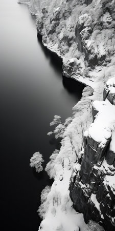 snow-covered mountains and a large lake are beautifully captured in this high-quality national geographic photo. taken in rural china, the image showcases the stunning scenery in the style of infrared filters, creating a distinctive black and white effect. the organic stone carvings add an extra touch of artistry, making this photo a true representation of the essence of nature. ai generated