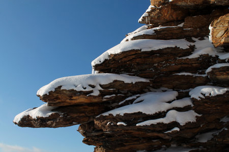 Snowy Rock in the forest. Video. snowy rocks in the mountains with clear sky. Snowy mountain with folding rock layers