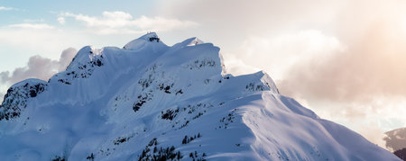 Snow Covered Mountain Tops in Canadian Nature Landscape. Aerial. Near Squamish, British Columbia, Canada.