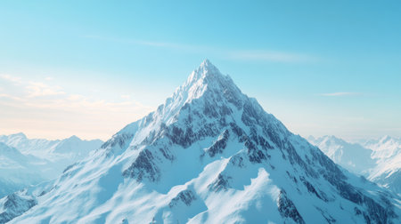 Minimalist sunny mountain landscape with snow-covered mountain top in golden sunshine in clear blue sky. Minimal alpine scenery with high snowy pinnacle in sunlight. Snow on sharp rocks on pointy peak