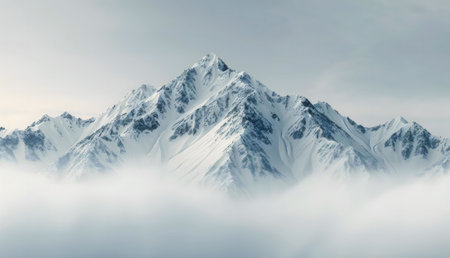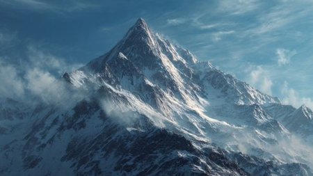 Snow blankets the rugged peak as clouds drift around, showing the beauty of winter in the mountains.