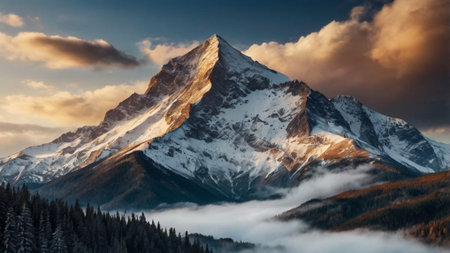 Beautiful mountain landscape with snow-capped peaks in the clouds.