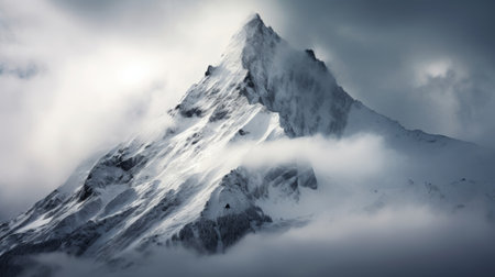 Beautiful alpine mountain landscape with snow covered peaks in the clouds