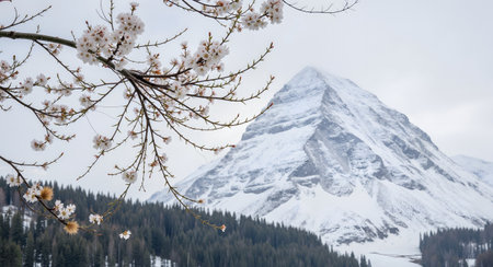 Mountain landscape with snow-capped peaks and coniferous forest
